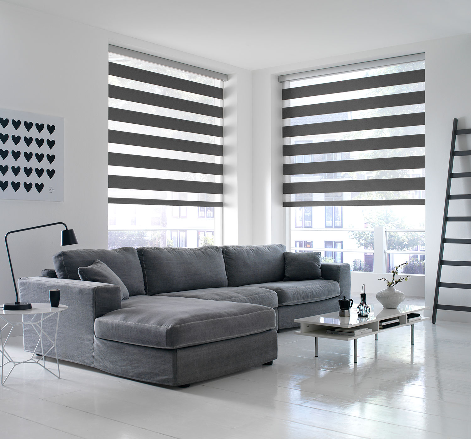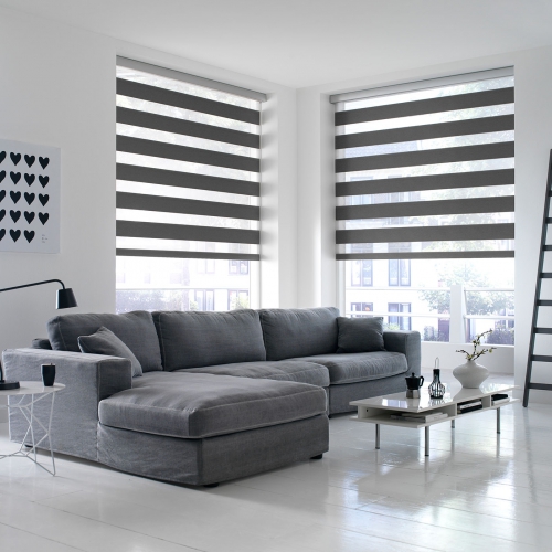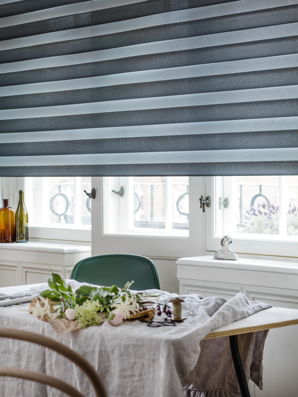 Duo är en ny variant av sol- och insynsskydd som ger helt nya möjligheter till en harmonisk innemiljö med dagsljuset som ljuskälla.Den smarta konstruktionen gör att du själv väljer hur mycket ljus, eller insyn, som ska skärmas av. Allt från fullständig avskärmning till fullt insläpp. Väven är delvis transparent vilket innebär att man inte behöver dra upp gardinen för att få ett härligt mjukt ljus i rummet. Duo är en spännande och elegant inredningsdetalj för varje rum!